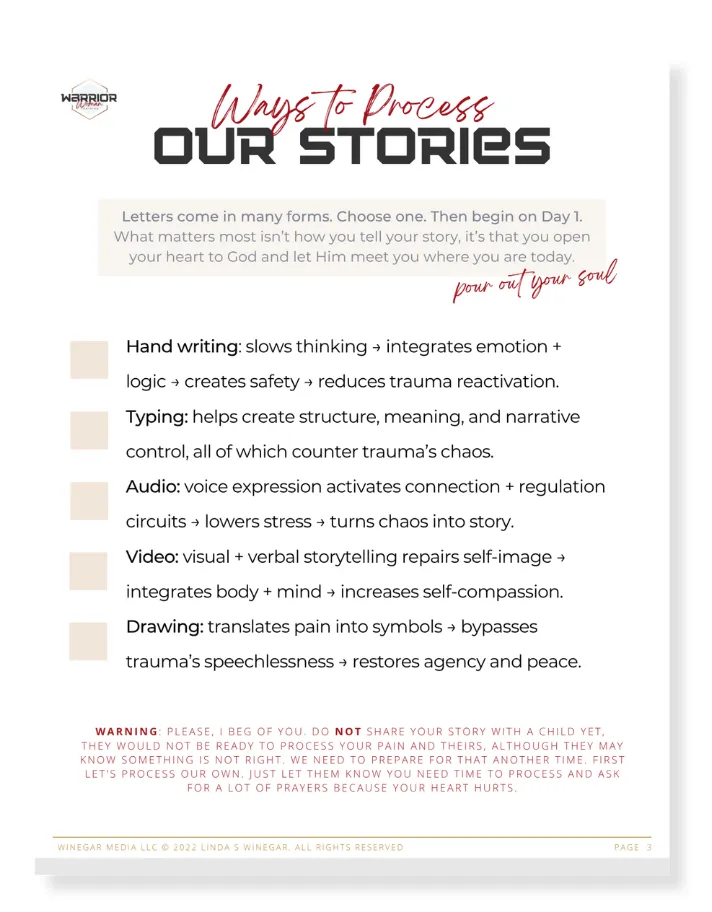 Letters from the Battlefield is a guide through 5 gentle journaling prompts. You'll be guided to share with God honestly about what hurts, and feel His love speak back in a safe place.